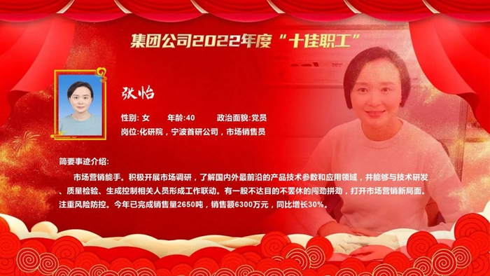 為激勵苦干實干、樹立身邊典型、打造先進品牌,不斷強化廣大職工“企業(yè)發(fā)展、我有責任,拼搏‘3+1’、我在行動”主人翁意識,促進企業(yè)高質量發(fā)展,經(jīng)企業(yè)推薦、廣泛遴選、優(yōu)中選優(yōu)、民主集中、會議研究,北京化工集團決定,授予北京市化學工業(yè)研究院有限責任公司寧波首研公司市場銷售員張怡(女)等10名同志北京化工集團2022年度“十佳職工”,并在北京化工集團二屆一次職代會暨2023年度工作會上予以表彰。