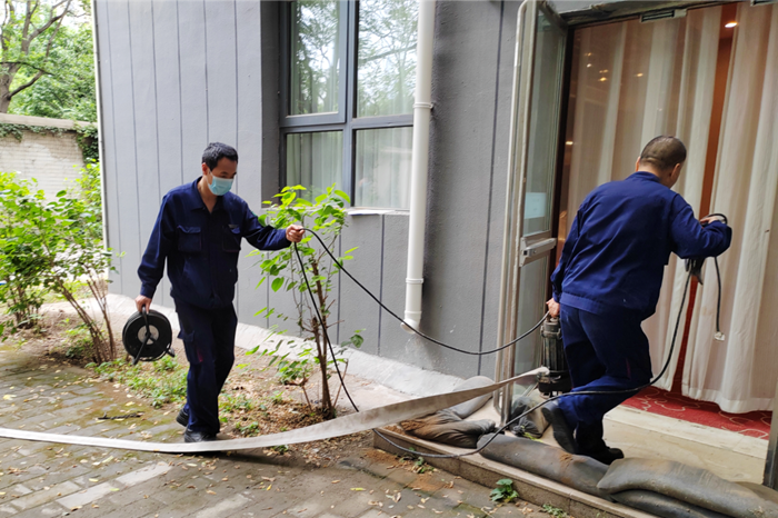 接到指令的工程部人員攜帶搶險排澇設備:潛水泵、防水線軸、排水水帶趕到現(xiàn)場,迅速開展排澇搶險工作;接到搶險指令的客房部人員攜帶吸水機、舊布草、拖把隨即到達現(xiàn)場,對室內殘存的積水進行了處理。最終,在參與搶險的各部門人員的通力合作下,“內澇險情”得到了有效控制,保護了酒店財產(chǎn)不受損失。此次演練圓滿成功,達到了預期效果。
