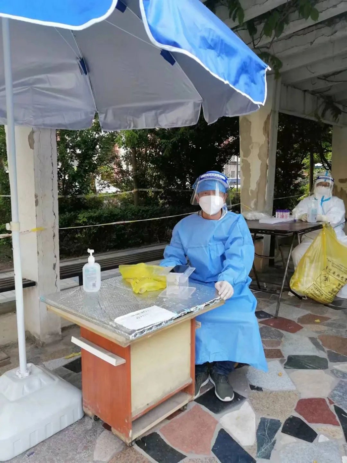 隨著天氣愈發的燥熱,換上大白的我們,衣服瞬間就已經濕透了,但大家沒有一句怨言,繼續戰斗在檢測一線。有的時候做核酸的居民太多,我們的醫護人員和志愿者不能按時吃飯,好在小區的群眾都很配合,一句句“謝謝,辛苦了”沁入心脾,真的很感動。