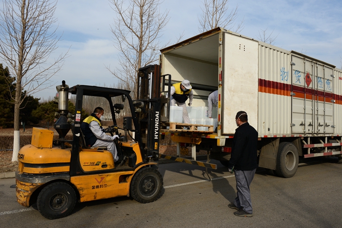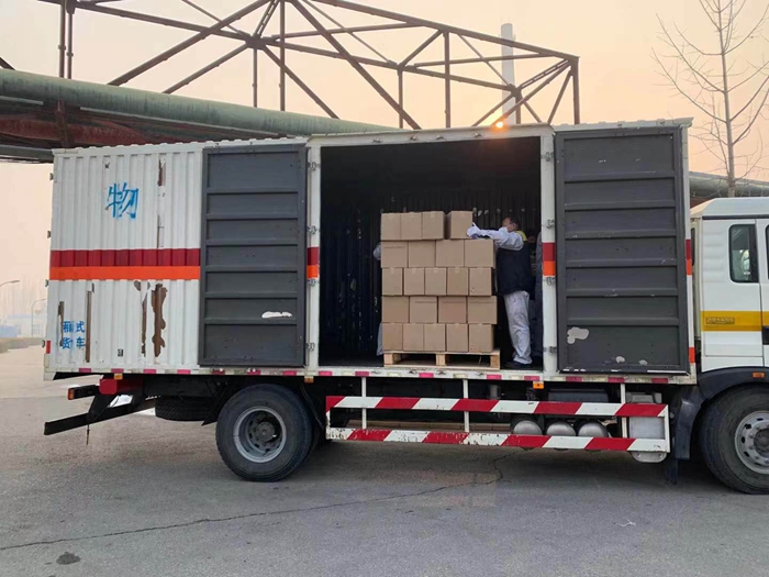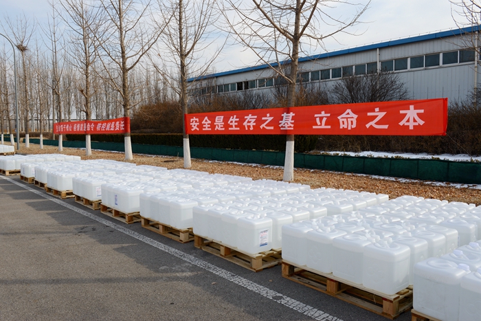 根據(jù)用戶(hù)反饋的需求信息,經(jīng)市物資保障組決定,將25L大包裝調(diào)整為500ML/瓶小包裝,北化集團(tuán)承擔(dān)相關(guān)卸貨、進(jìn)庫(kù)、儲(chǔ)存、配送任務(wù)。由華騰化工公司倉(cāng)儲(chǔ)事業(yè)部、安全生產(chǎn)部、保衛(wèi)部、公用工程事業(yè)部20名同志負(fù)責(zé)卸貨入庫(kù)。