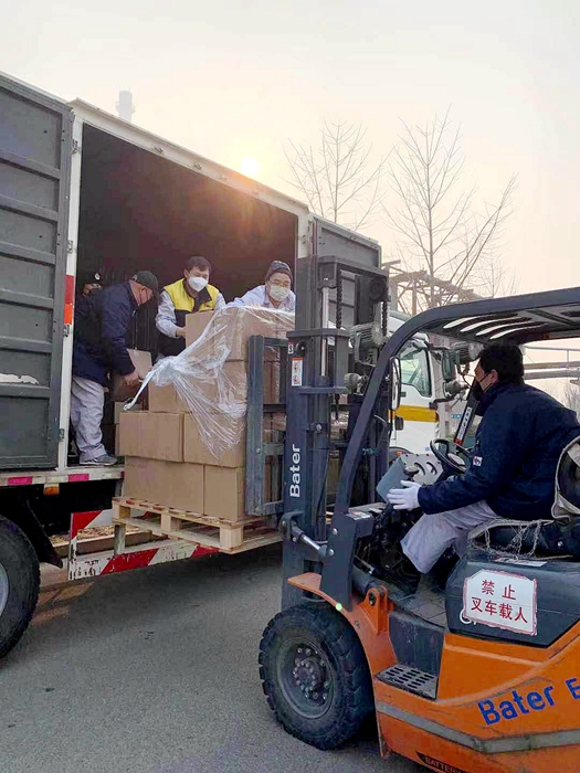 2月14日,全市普降大雪,當(dāng)天又新運(yùn)到5000箱500ml裝消毒酒精,華騰化工的職工們?nèi)吮Ъ缈浮⒚把┩瓿闪诵盾?chē)任務(wù)。