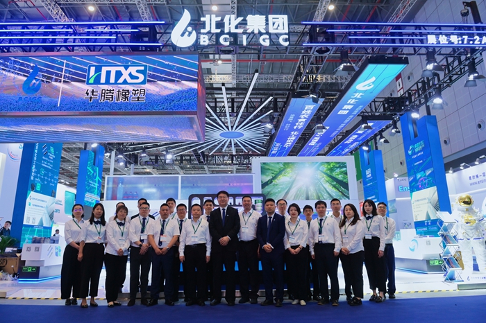 展會期間,北京化工集團黨委副書記、董事、總經理楊旭輝,副總經理張榮寰,總會計師金黎明也來到集團展臺參觀指導。楊旭輝一行聽取了現場各企業的詳細介紹,深入了解現場展示的儲氫瓶內膽材料、LNG船用膠、航天手套等高精尖產品,親切慰問現場工作人員。