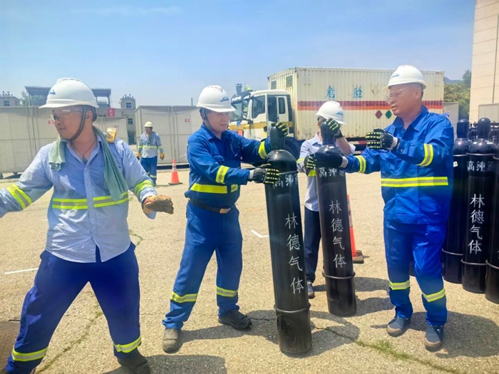 為了在規(guī)定時(shí)間完成相關(guān)任務(wù),北普公司將全部人員分成若干工作小組,組長都是由多次參加重大活動保障任務(wù)的老員工擔(dān)任,小組的主要任務(wù)是在規(guī)定時(shí)間內(nèi)將鋼瓶推放并綁定在指定位置,裝表、聯(lián)管、上槍、調(diào)壓,充氣作業(yè),巡視、加壓、換瓶,一個(gè)個(gè)規(guī)范動作都責(zé)任到小組到個(gè)人,目標(biāo)只有一個(gè),配合協(xié)作單位在規(guī)定時(shí)間內(nèi)完成罐裝,以最安全的方式、最快的速度將現(xiàn)場高純氦氣鋼瓶撤出,確保特制移動籠房能夠準(zhǔn)時(shí)出發(fā)。