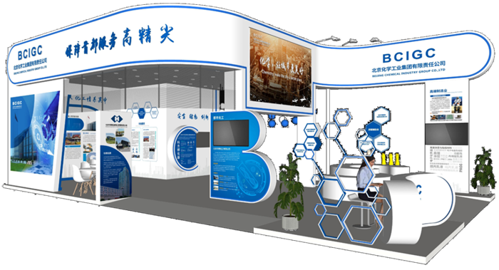 北京化工集團所設展臺突出“化學讓未來更美好”理念,將所屬企業進行集中整合,實現集約化參展。展臺通過華騰橡塑公司的橡塑手套加上炫彩效果,融入化學工業試管造型(頂部結構)、原子造型(造型伸縮燈球,現場展示不同造型)、分子結構(苯環造型)等化學元素,柔和加入聲光效果,提升展臺氛圍效果,以弧形結構為紐帶,敞開懷抱,擁抱大眾,讓化學走入人們的生活,以開放形態創造美好生活!